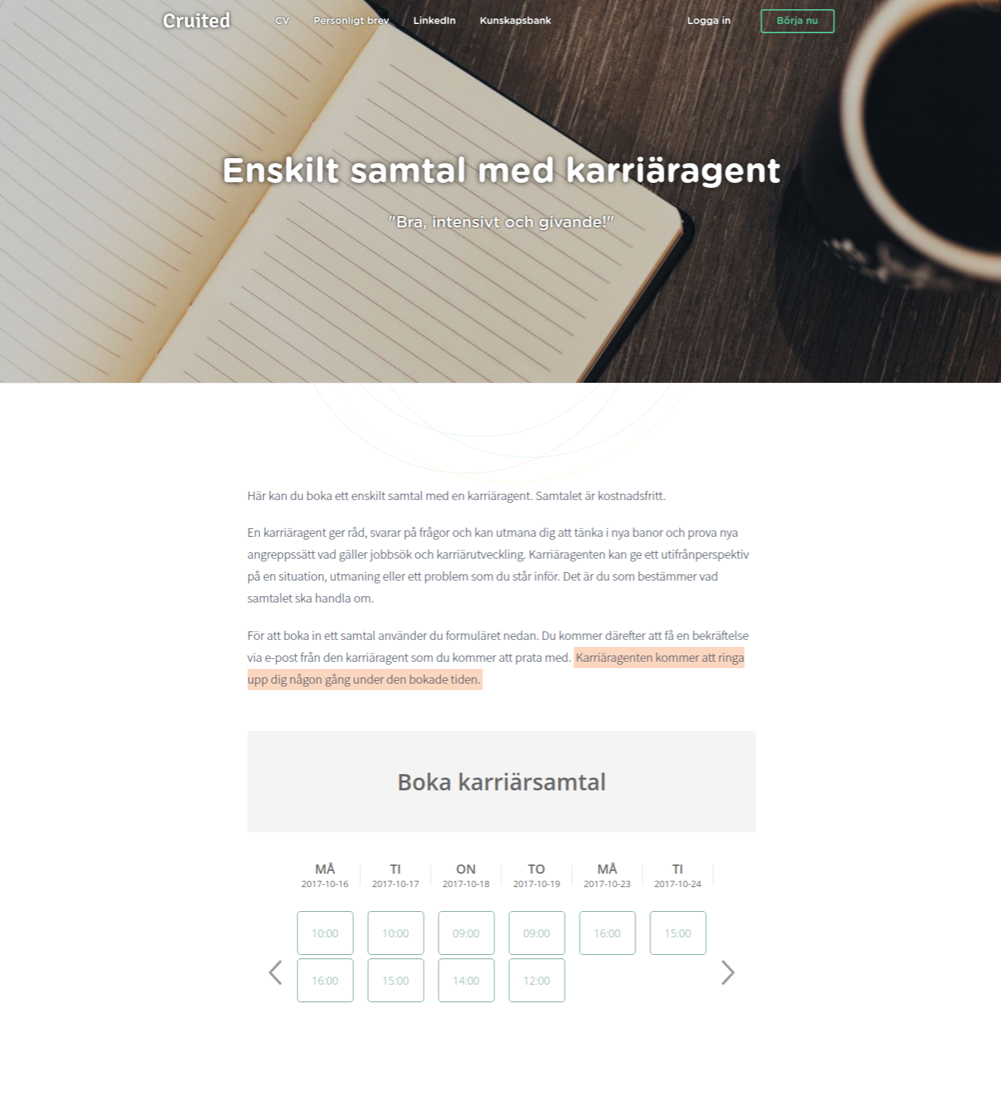 Professionell karriärrådgivning levereras traditionellt per timme och bokas i paket med ett flertal tillfällen. Det upplevs som svåråtkomligt och många väljer att avstå från att ta hjälp. Cruited har brutit upp processen och låter kunden beställa exakt det den behöver, till fast pris. Beställningar och bokningar sker online och man beskriver själv sin situation för att så snabbt som möjligt få den hjälp man behöver.