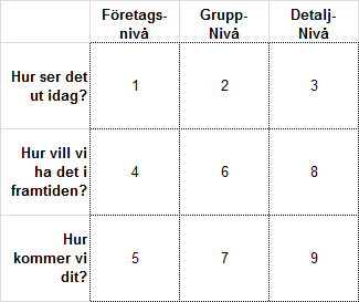 Det vi kom fram till var grovt sett ett upplägg för hur vi ska gå vidare med kartläggningen. Vi kom fram till att vi behöver kartlägga processerna på tre olika nivåer. Dels på en 10.000-metersnivå, för att förstå hur företaget ser ut ur ett fågelperspektiv. Något som alla passar in i. Vi behöver också se hur det ser ut från en 5.000-metersnivå, det vill säga på gruppnivå. Hur jobbar olika grupper och hur skiljer sig arbetssättet mellan grupperna? Slutligen behöver vi se hur det fungerar på individnivå. Är det så att enskilda individer har egna arbetssätt som inte stämmer överens med gruppernas? Utöver det behöver vi se var och en av nivåerna på tre olika sätt. Hur det ser ut idag, hur vi skulle vilja att det såg ut och hur vi genomför det. Så det blev en modell med nio rutor.