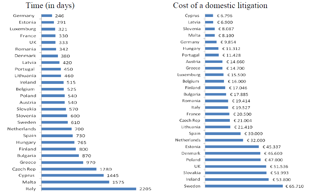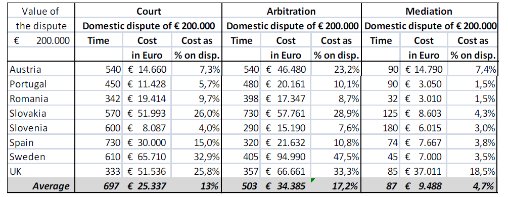 Sverige i tabellen ovan har en kostnad på 65.710€ (nästan en tredjedel av tvistens värde) för att lösa tvisten i domstolsprocess jämfört med 7.000€ vid medling. Tiden vid domstolsprocess är i snitt 610 dagar jämfört med 45 dagar i snitt vid medling. Till det får man också lägga att medlingen i många fall har två vinnare och relationen kan överleva, medan domstolsprocessen i bästa fall har en och i värsta fall två förlorare.